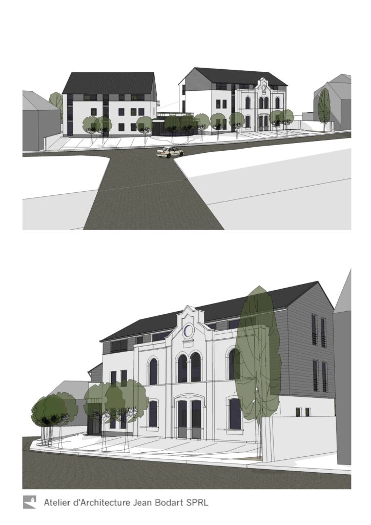Le premier projet* (voir ci-dessus dessins transmis à l’époque par l’architecte) avait été refusé par le Conseil d’Etat. En effet, ce projet mené par la société de logements Notre Maison était trop ambitieux (deux bâtiments et une crèche), principalement au niveau du nombre de logements. L’Atelier d’Architecture Jean Bodart finalise, actuellement, la seconde mouture. Notre crainte était de voir abandonner, dans le nouveau projet qui ne comprenait plus qu’un bâtiment et la crèche, le dessin de l’ancienne façade. Celle-ci ayant dû, à l’époque déjà, faire face à l’hostilité de certains. Renseignements pris, le bâtiment conserve bien le dessin ancien et son gabarit est même plus proche de celui de la façade initiale. La Commune, elle, est décidée à maintenir sa délibération du 16 décembre 2012 :